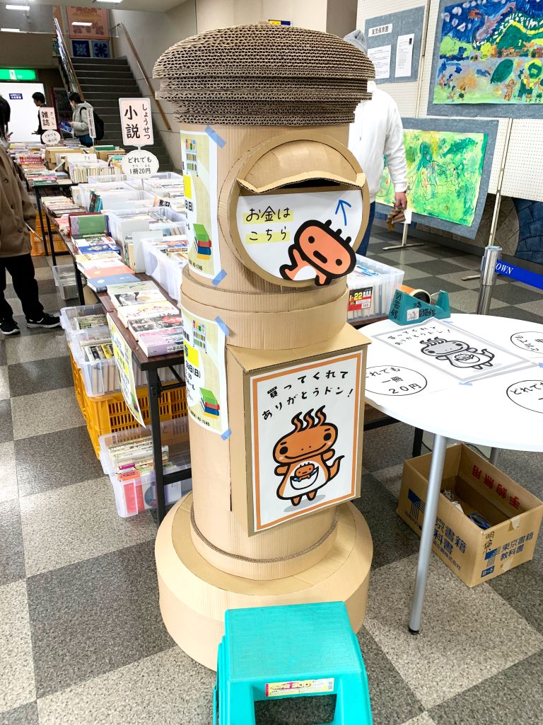 古本市は、小説やエッセイ、実用書、児童書、絵本、雑誌などがどれでも1冊20円。「湯けむり怪獣ミササラドン」のガイドに従い、なんとも可愛らしい段ボールでできたポストにお支払い📮ちなみにこのポスト、三朝町の地域おこし協力隊の隊員さんが倉吉にある実際のポストを忠実に再現して作ったそうです。