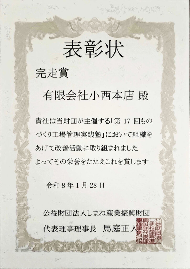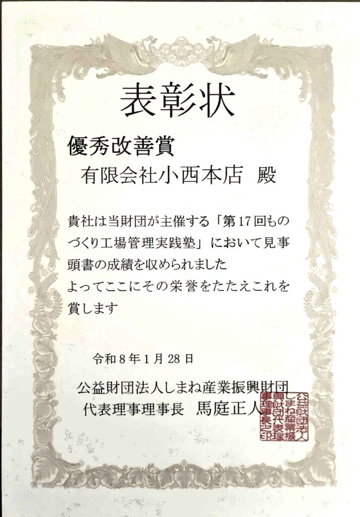 今年で17回を迎える【ものづくり工場管理実践塾】は、しまね産業振興財団が主催している、県内のものづくり企業の収益力強化の視点から生産現場の考えるムダを徹底的に洗い出し、改善に取り組むためのセミナーです。当社は今回初参加でしたが、なんと!『優秀改善賞』をいただきました!